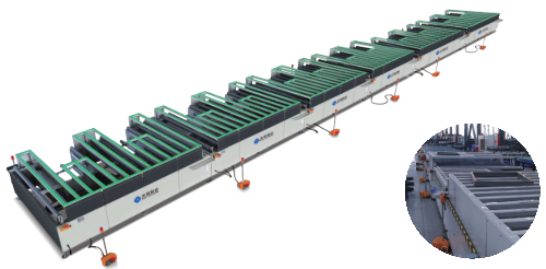 ☆?連接于組角生產線后端,用于組角后窗體的自動傳輸,并可在本輸送線上完成中梃拼裝、安裝膠條、安裝五金、壓條配做,直至包裝入庫的各種工序;